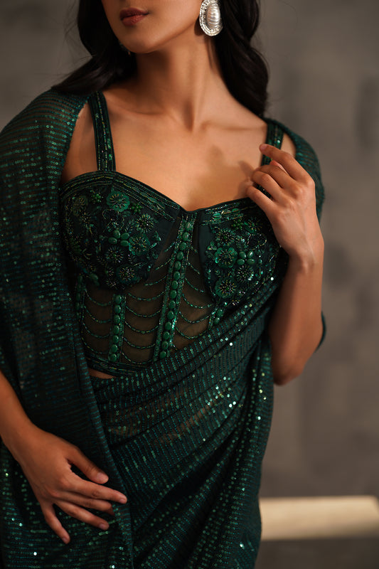 Bottle Green Embroidered Corset and Drape Saree