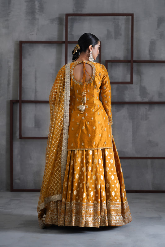 Mustard Embroidered Kurti, Brocade Lehenga and Dupatta