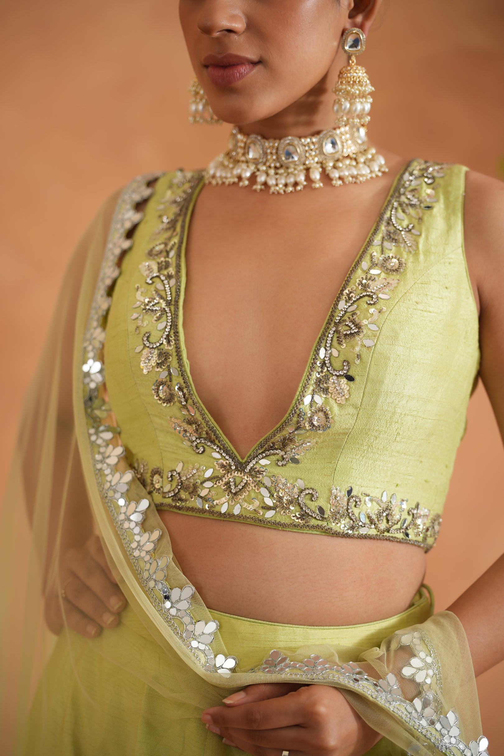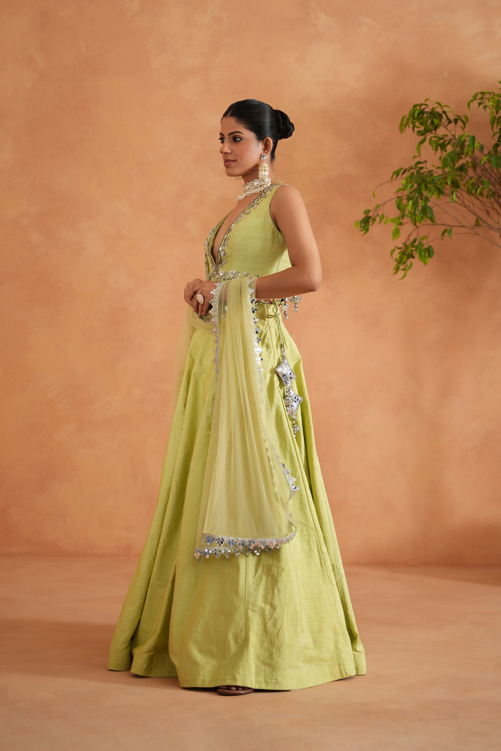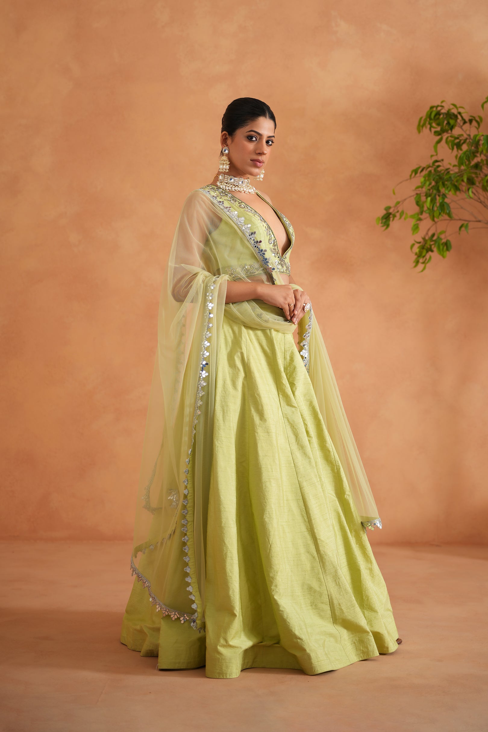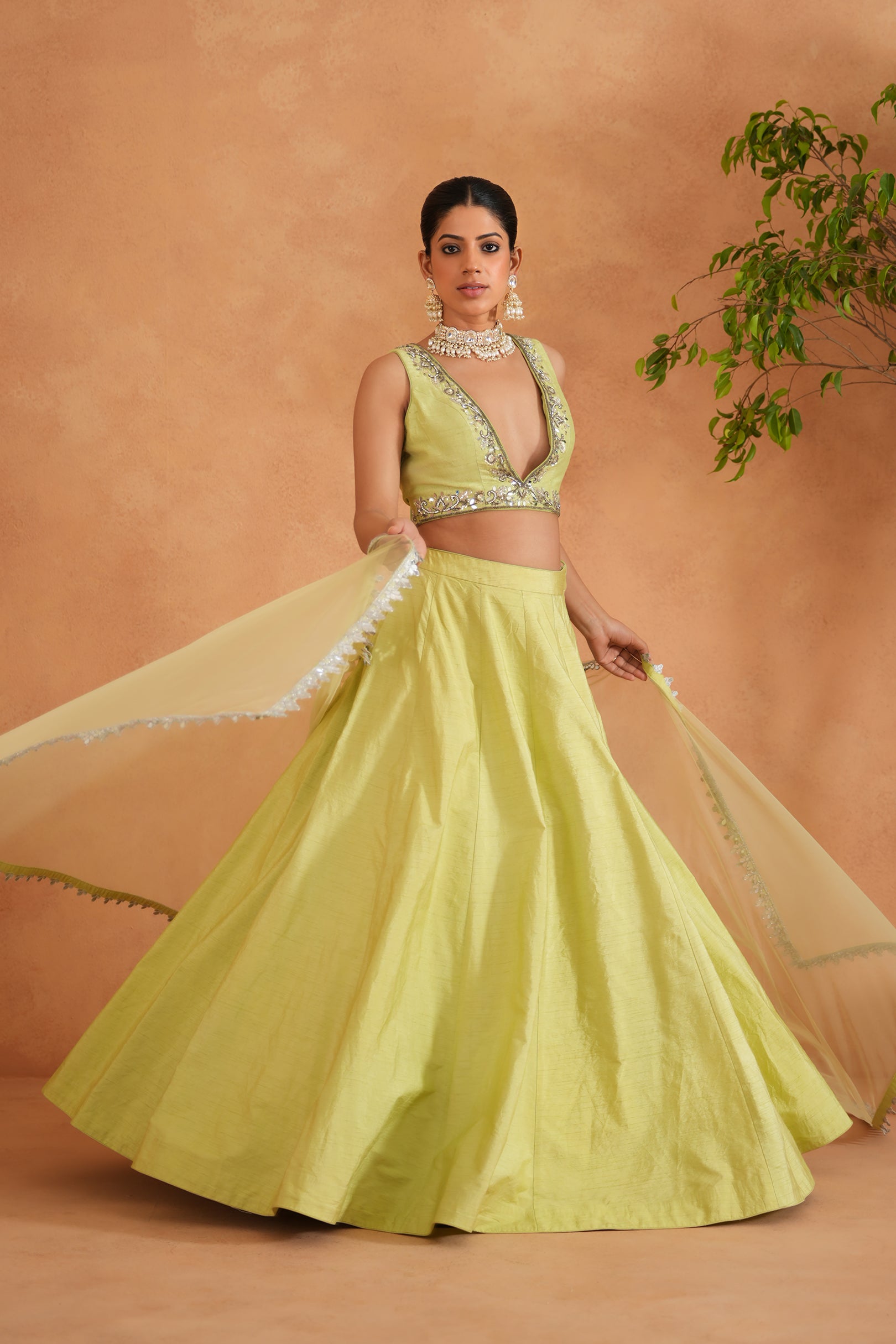 Deepika Chadha's stunning Lime yellow dupion silk fabric bustier beautifully adorned with intricate mirror embroidery on neckline and waist. The flowy lime yellow lehenga adds a touch of tradition and sophistication to your look, while the soft net Dupatta with mirror borders is perfect for wedding and festive season.